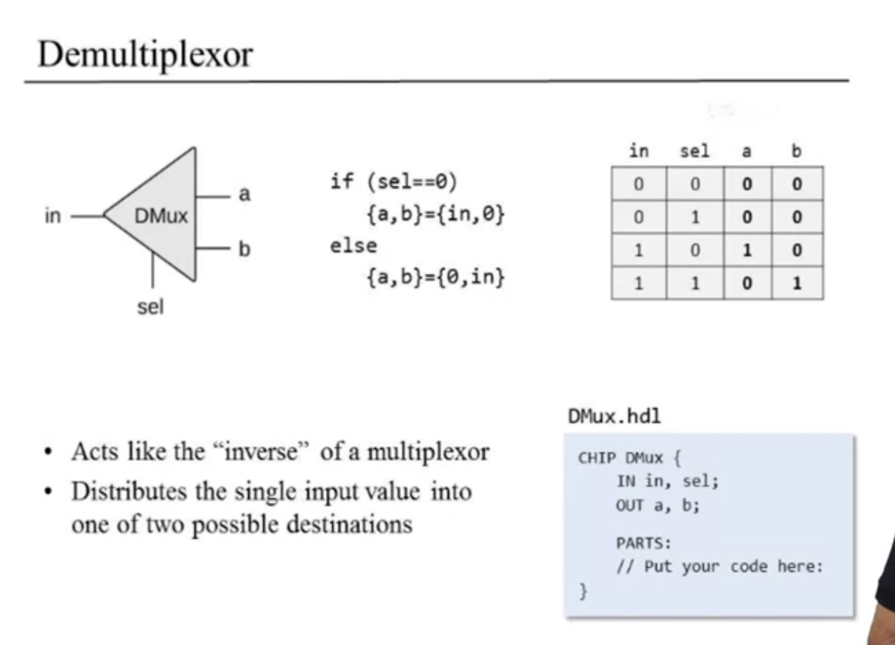 it recieves a single input, and based on the selection bit, it either channel the input to an a output, or to a b ouput.