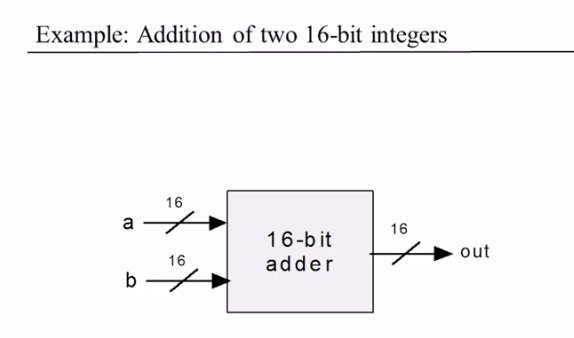 our chips has 32 wires feeding intto it, and 16 wires going out of it, but still it's convenient to think about it as two numbers feeding in and one number feeding out.