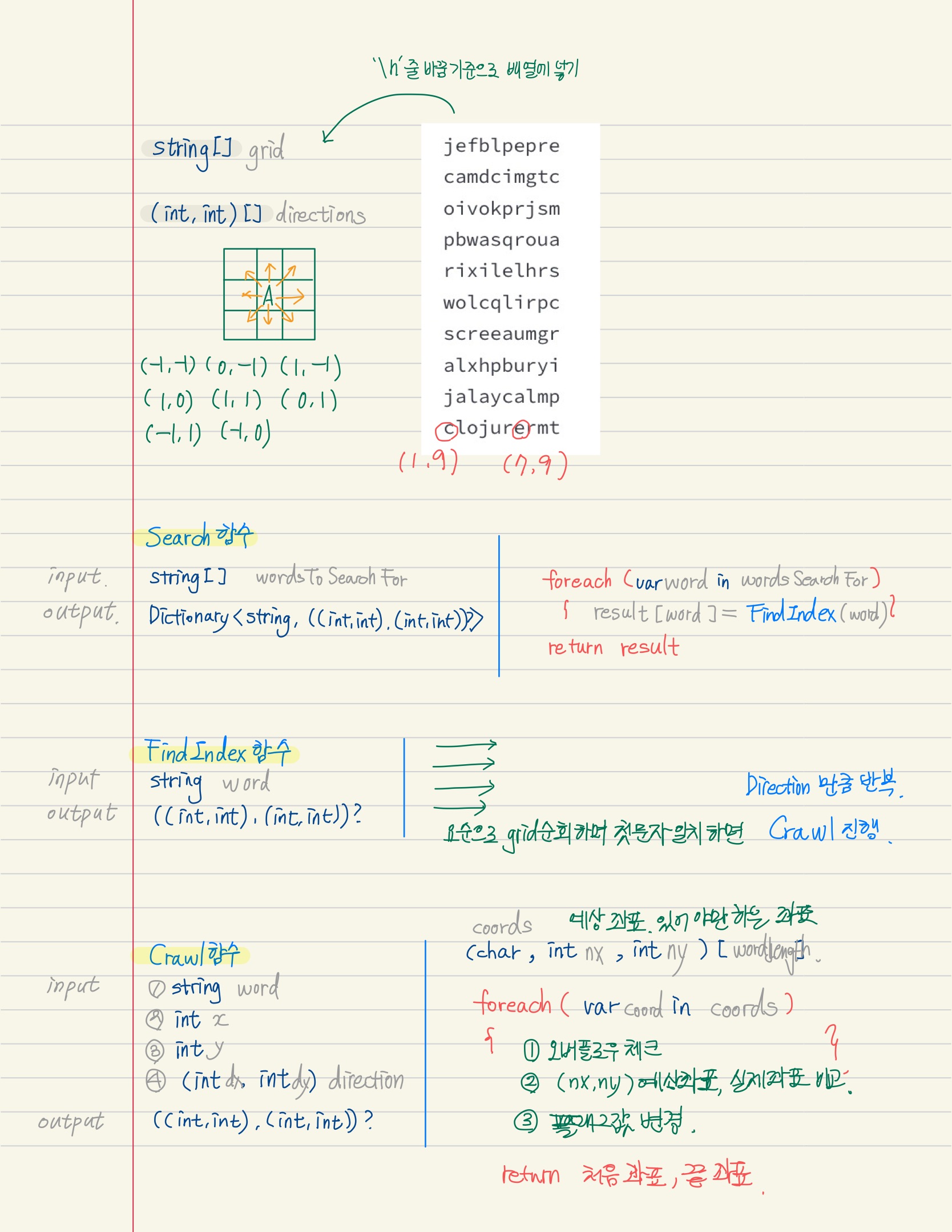 좌우, 상하, 대각선 방향으로 찾고자 하는 단어가 있는지 확인하고