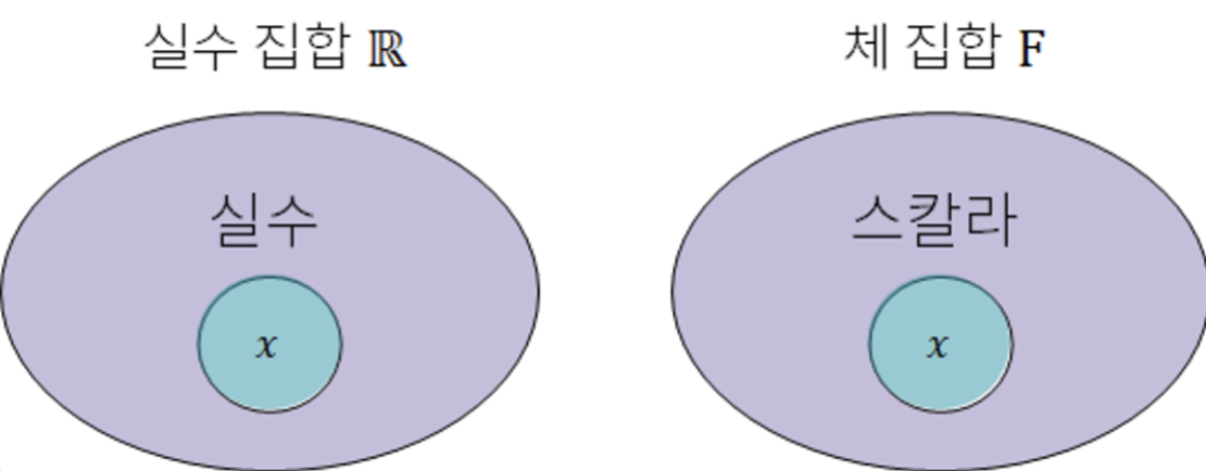 - 체 집합은 F로 표현하고 체 집합의 원소를 스칼라(scalar)라고 한다.