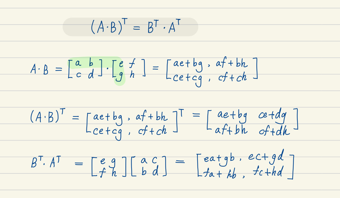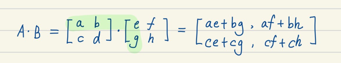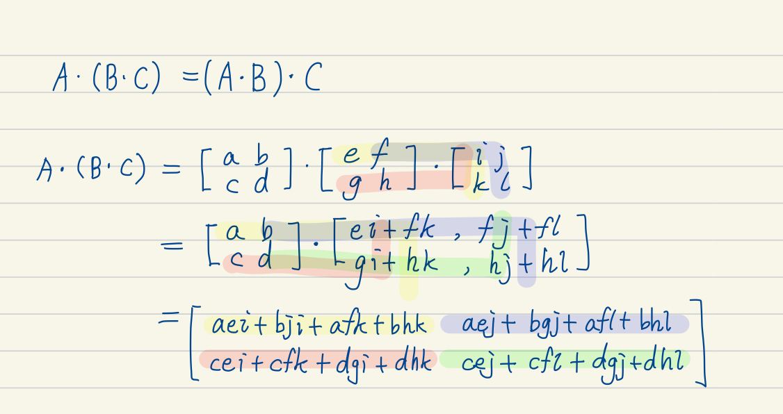 행렬은 하나의 선형 변환에 대응되며, 행렬의 곱은 선형 변환을 적용한 결과에 다시 선형 변환을 적용한 결과를 다음과 같이 진행된다.