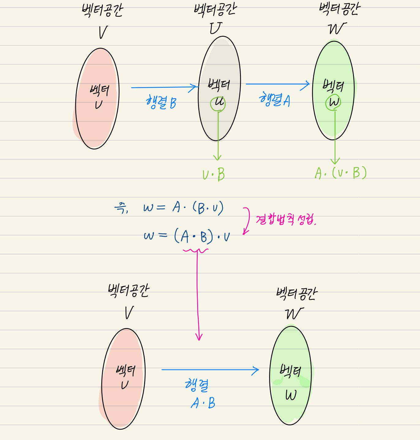 두 행렬을 곱한 식(A·B)는 벡터공간 V에서 벡터공간 W로 직행하는 합성 변환을 의미하며