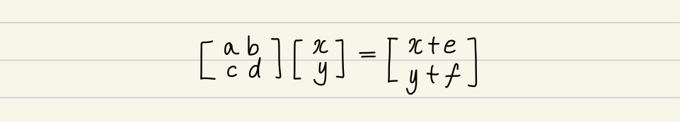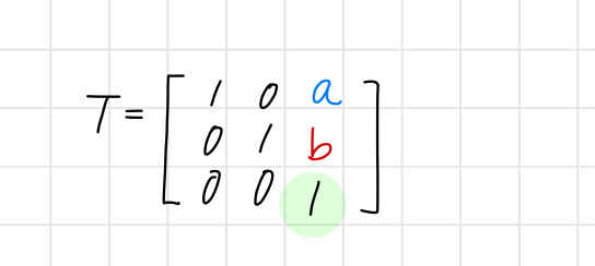 수식으로 나타내면 다음의 3차원 정방 행렬을 사용하면 원하는 만큼 2차원 평면의 이동 구현이 가능해진다.