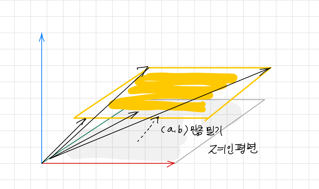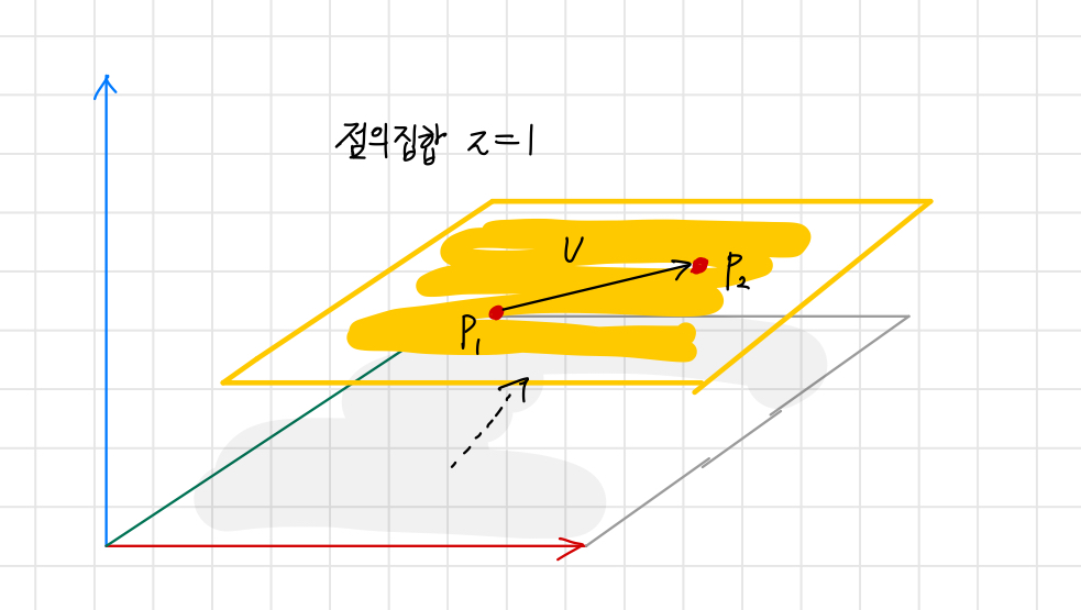 무대가 되는 벡터 공간에서 노란색을 구성하는 부분 공간을 아핀 공간A이라고 한다.