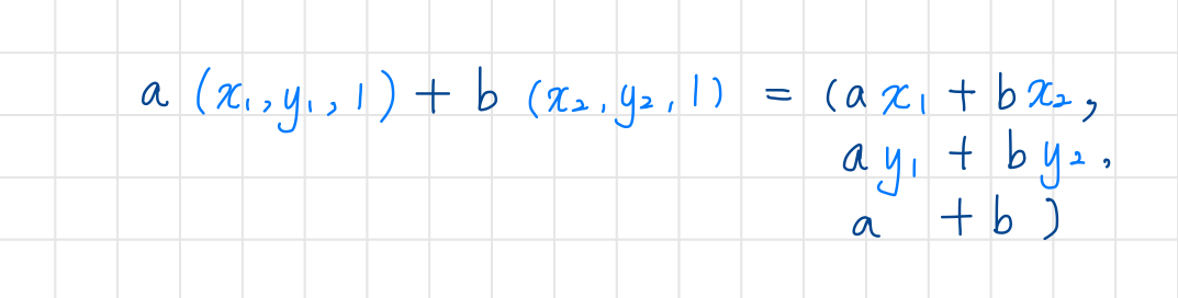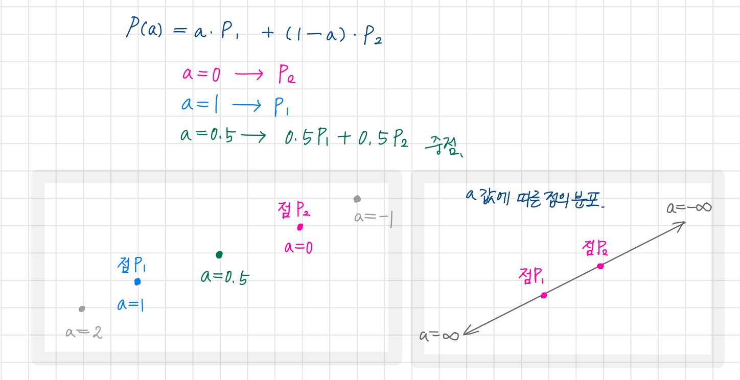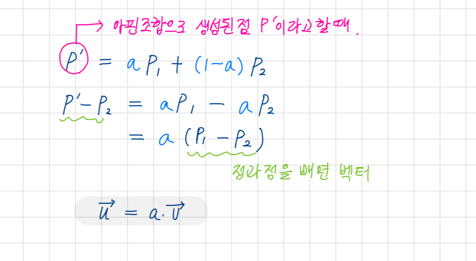 점과 점의 연산은 불가능하지만, 스칼라를 이용해서 새로운 점을 만들어내는 식을 아핀 조합이라고 한다