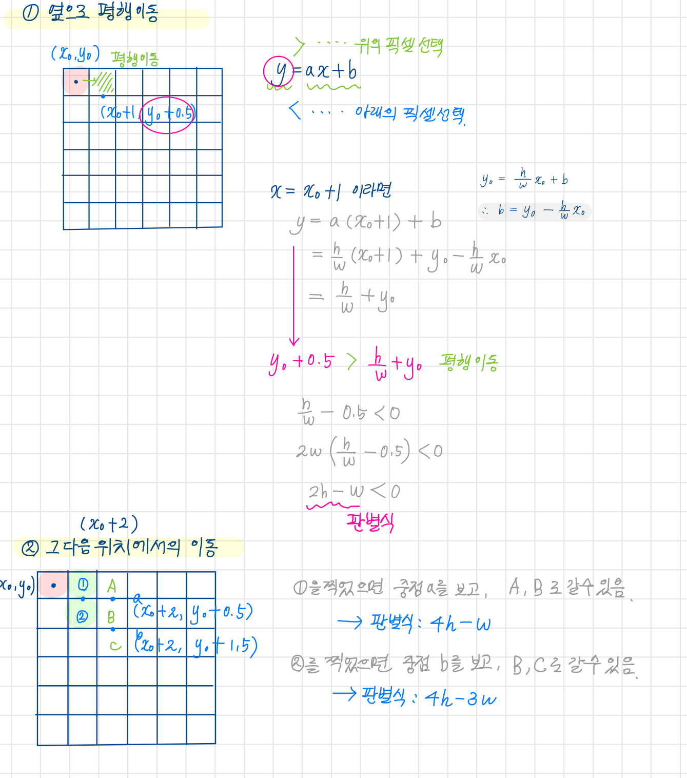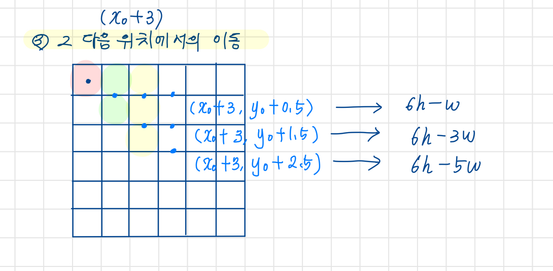 x와 y가 바뀐 상태로 동일하게 알고리즘을 진행하면 되며, 판별식은 2w-h가 된다.