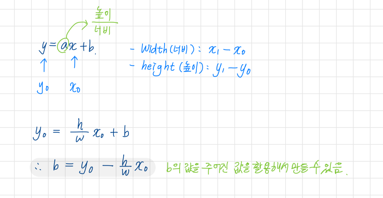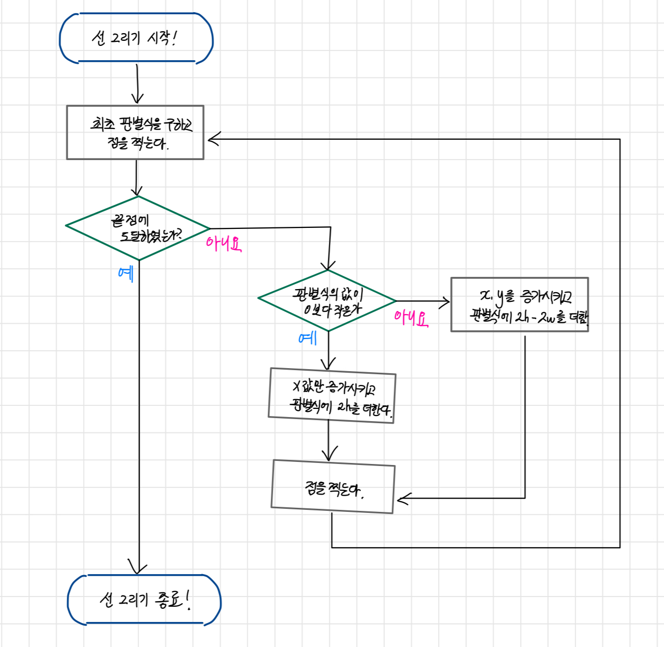 시작점을 찍은 후 다음 점이 평행 이동하는지 한칸 아래로 내려가는지는 중점값을 보고 판단한다.
