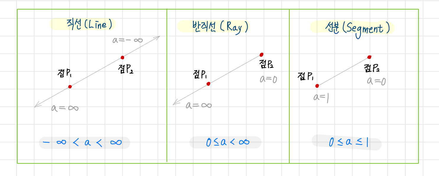 - 반직선과 직선 모두 무한대로 뻗어가기 때문에, 그리기엔 적절하지 않지만 선분은 적절