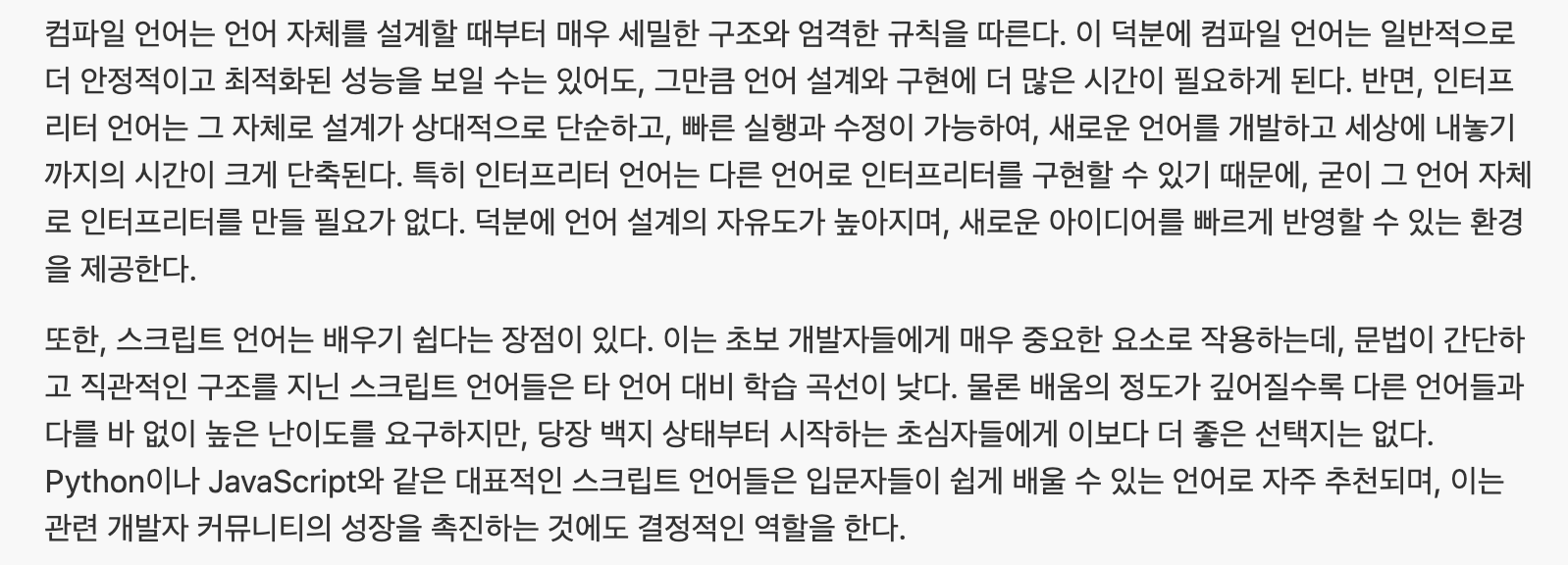 | 오류 수정 | 소스 코드 수정 후 다시 컴파일하여 실행파일을 만들어야 한다. | 소스 코드를 수정하여 바로 실행해 결과를 확인할 수 있다 |