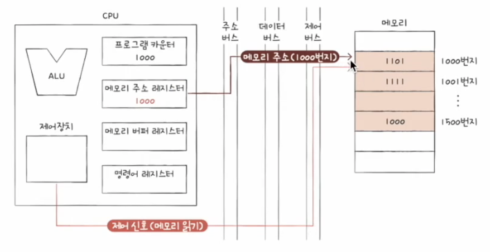 읽어 들인 값을 메모리 주소 레지스터에 복사한다. 메모리 한테 메모리 읽기 제어신호와 함께, 몇 번지 주소를 읽을 건지 주소를 알려준다. 메모리 주소 레지스터에 담긴 값의 의미: 내가 원하는 주소는 1000번지야! |