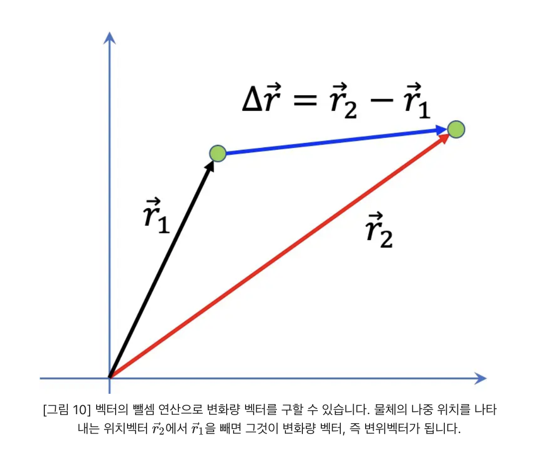 물체가 시간에 따라 이동한다고 할 때, 기준점으로 부터의 물체 초기를 나타내는 벡터 1, 일정 시간이 지난 후 나중 위치를 나타내는 벡터 2가 있을 것이다.